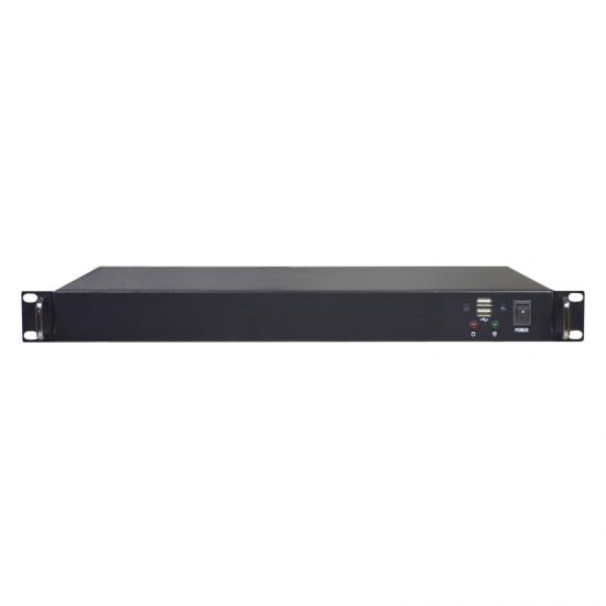 1U 上架式整机 / H61M10 主板 /G2120/3.1G 主频双核双线程 /4G 内存/120G 固态硬盘 / 小 1U ATX 150W 电源 / 外露接口:2 个网口、10 个RS232 串口、VGA+HDMI(支持独立双显)、8 个 USB 前 2 后 6(通过插针可再引出 2 个 USB),1 个音频组合、1 个 PS/2 二合一键鼠接口、1个 LPT 插针、1 个 PCIE x16。